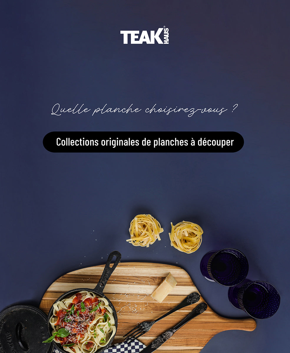 Planches à découper et planches de présentation en bois Teak Haus . La marque Teak Haus exploite ses propres forêts dans le respect des normes sociales et environnementales rigoureuses définies par le FSC (organisation à but non lucratif engagée dans la gestion responsable des forêts et notamment la méthode de l'éclaircissement qui respecte la biodiversité). Le teck est un bois dur tropical utilisé depuis des siècles dans la construction de navires car très résistant à l'eau. C'est une matière durable qui, grâce à sa haute teneur en huile naturelle, et à son grain de bois dur garde les couteaux bien aiguisés.